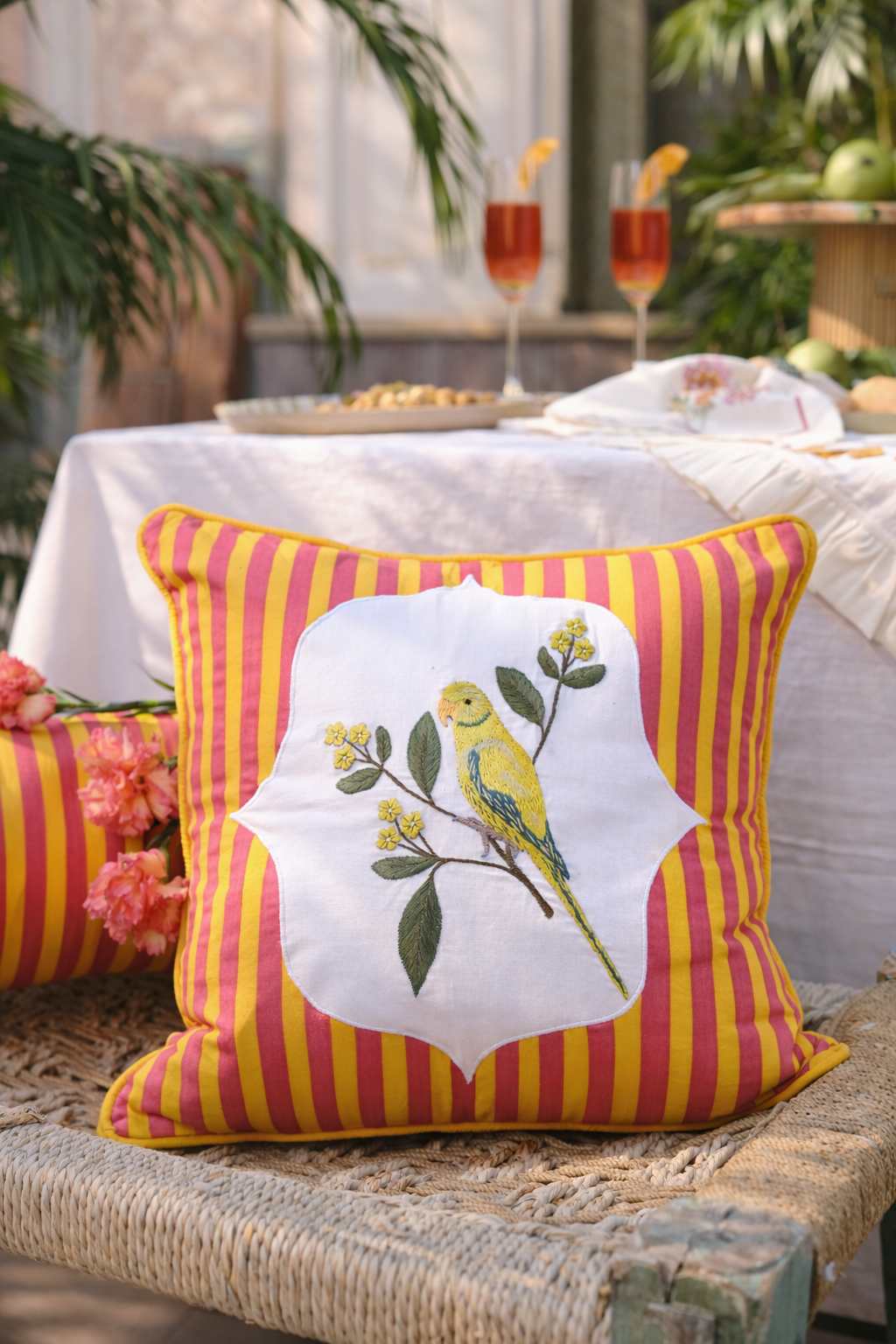 Parrot in Gulabi Nagri Embroidered Cushion